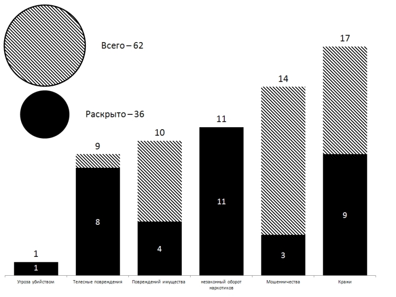 Краж — 17/9, с садовых участков — 3/2, из автомобилей — 2/0, из гаражей — 2/0, в общественных местах — 6/5, прочих — 4/2.