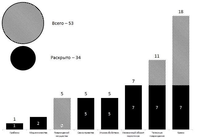 Краж — 18/7, из автомобилей — 1/0, из гаражей — 1/0, в общественных местах — 6/4, прочих — 10/3.