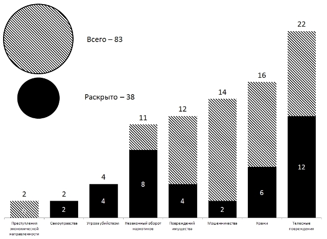 Телесных повреждений — 22/12, из них на бытовой почве — 8/8, из хулиганских побуждений — 14/4.