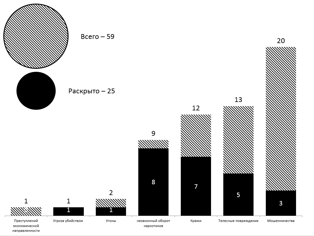Зарегистрировано 59/25 обращения о происшествиях и преступлениях. Краж — 12/7, из квартир — 1/0, с садовых участков — 1/0, из автомашин — 2/1, в общественных местах — 6/6, прочих — 2/0. Мошенничеств — 20/3. Преступлений экономической направленности — 1/0. Угонов — 2/1. Незаконного оборота наркотиков — 9/8. Телесных повреждений — 13/5, из них на бытовой почве — 2/2, из хулиганских побуждений -11/3. Угроз убийством — 1/1. Суицидов — 1. Дорожно-транспортных происшествий — 42. Административных правонарушений — 624, из них нарушений паспортных правил — 5, в сфере безопасности движения — 440, в состоянии опьянения — 1. Мелких хулиганств — 14, появлений в общественных местах в пьяном виде — 33,