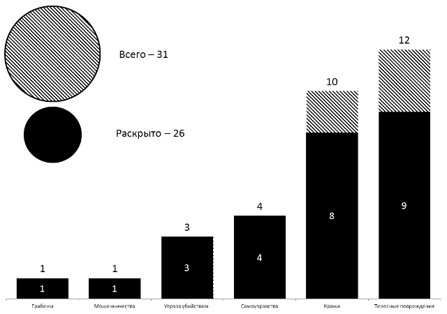 Краж — 10/8, из квартир — 2/2, в общественных местах — 7/6, прочих — 1/0.