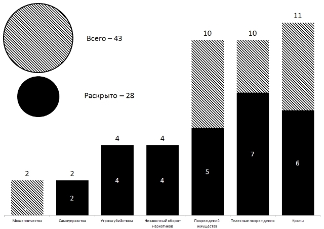 Краж — 11/6, из квартир — 2/2, в общественных местах — 5/4, прочих — 4/0. Мошенничеств — 2/0. Незаконного оборота наркотиков — 4/4, самоуправств — 2/2. Телесных повреждений — 10/7, из них на бытовой почве — 4/4, из хулиганских побуждений — 6/3. Угроз убийством — 4/4. Повреждений имущества — 10/5, дорожно-транспортных происшествий — 30. Административных правонарушений — 955, из них нарушений паспортных правил — 7, в сфере безопасности движения — 761, в состоянии опьянения — 5. Мелких хулиганств — 16, появлений в общественных местах в пьяном виде — 28, за распитие спиртного в общественных местах — 62.
