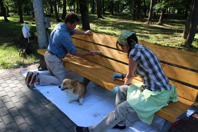 После обеда, когда небо разголубелось, действие переместилось в парк. Здесь посетители в течение трех часов могли выбирать себе занятие по душе на интерактивных и концертных площадках. Темой мастер-классов стала любовь к Родине, а главными цветами — красный, синий и белый. Особая миссия в этот день была у педагогов Детской художественной школы, которые расписывали четыре скамьи на тему счастья, любви, здоровья. Их презентация запланирована на День города 27 июня.