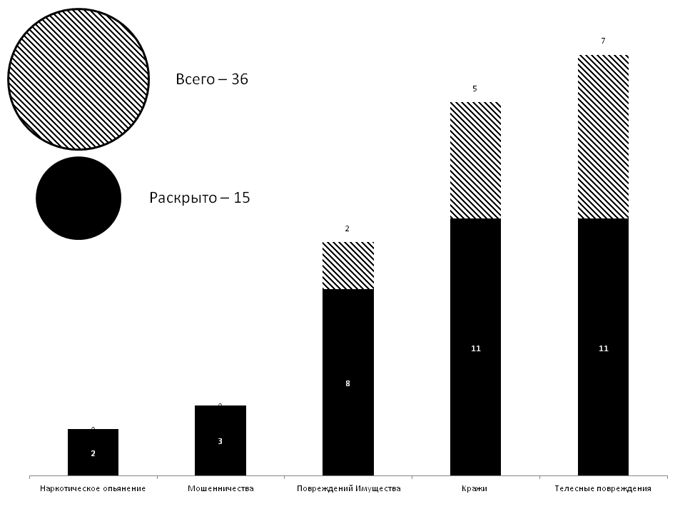 Зарегистрировано 36/15 обращений о происшествиях и преступлениях. Краж — 11/5. Мошенничеств — 3/0. Телесных повреждений — 11/7, из них на бытовой почве — 5/5, из хулиганских побуждений — 6/2. Повреждений имущества — 8/2. Оштрафованы за нахождение в общественном месте в состоянии наркотического опьянения 2 человека.