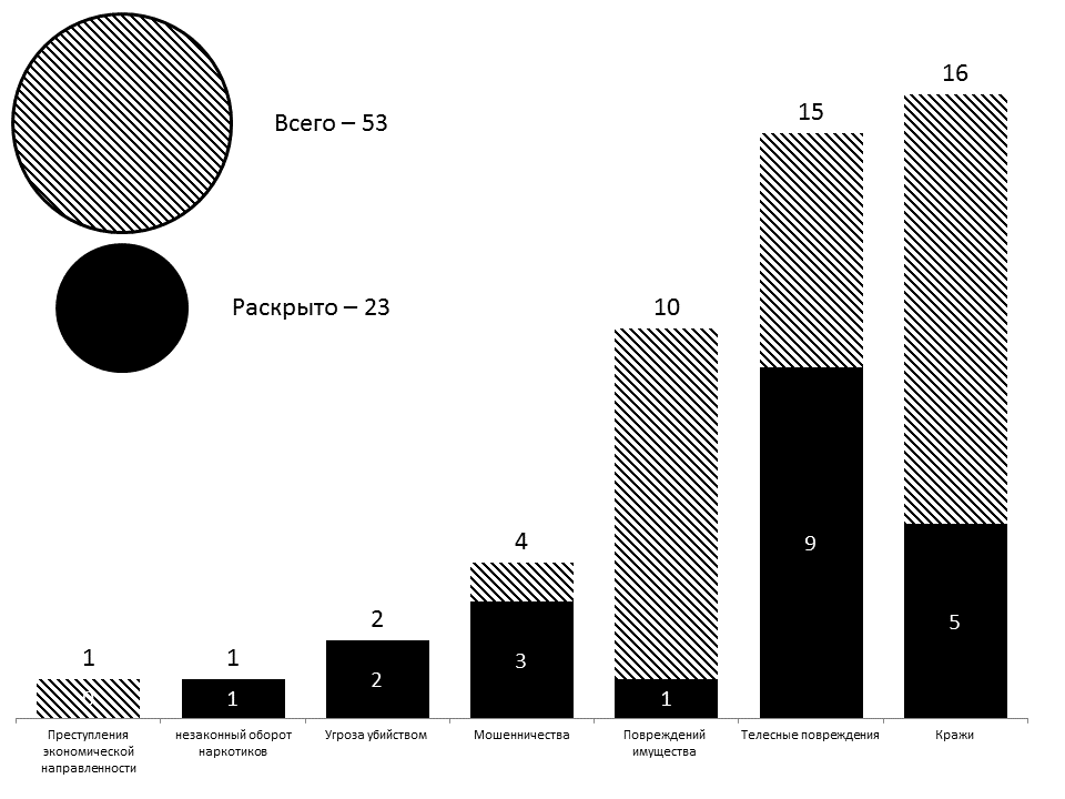 Зарегистрировано 53/23 обращения о происшествиях и преступлениях. Краж — 16/5, в общественных местах — 5/3, из квартир — 4/2, прочих — 7/0. Незаконного оборота наркотиков — 1/1. Мошенничеств — 4/3. Преступлений экономической направленности — 1/0. Угроз убийством — 2/2. Попыток суицида — 1. Оконченных суицидов — 1. Причинений телесных повреждений — 15/9, на бытовой почве — 2/2, из хулиганских побуждений — 13/7. Повреждений имущества — 10/1. Административных в сфере БДД — 500. ДТП — 15 (с пострадавшими — 1). Управляли транспортными средствами в состоянии алкогольного или наркотического опьянения либо отказались от медицинского освидетельствования — 5. Не пропустили пешеходов — 5. Нарушений требований дорожных знаков и разметки — 107. Тонировка — 14. Переходов дороги в неустановленном месте — 44.
