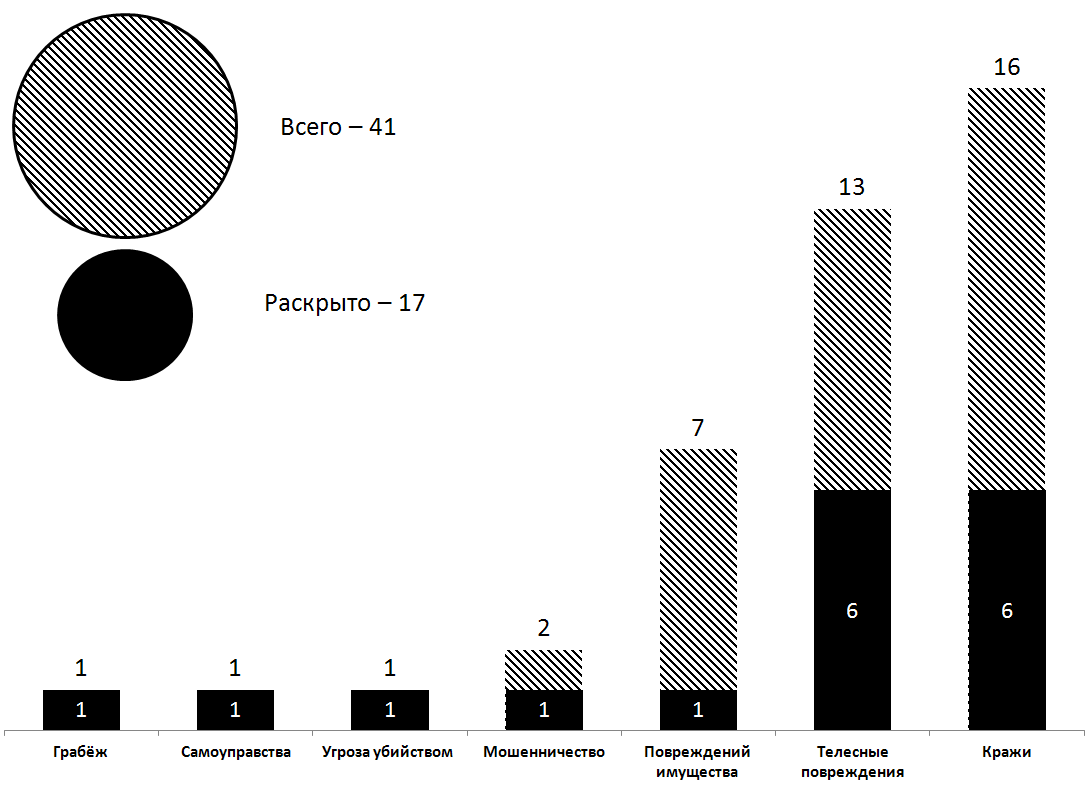 Зарегистрировано 41/17 обращение о происшествиях и преступлениях. Грабежей — 1/1. Краж — 16/6, из квартир — 1/1, с садовых участков — 1/0, из автомашин — 4/0, в общественных местах — 6/4, прочих — 4/1. Мошенничеств — 2/1. Самоуправств — 1/1. Угроз убийством — 1/1. Попыток суицида — 2. Причинений телесных повреждений из хулиганских побуждений — 13/6. Повреждений имущества — 7/1. Административных правонарушений — 786. Из них в сфере БДД — 634. ДТП — 13 (из них 1 с пострадавшим). Управляли транспортными средствами в состоянии алкогольного или наркотического опьянения либо отказались от медицинского освидетельствования 12 человек (из них 2 повторно в течение года). Не пропустил пешехода — 6. Тонировка — 7. Переходили в неположенном месте — 68. Нарушений требований дорожных знаков и разметки — 154. Нарушений паспортных правил — 9. Мелких хулиганств — 25. Распитий спиртных напитков в общественных местах — 26. Появлений в общественном месте в состоянии алкогольного опьянения — 45, в состоянии наркотического опьянения — 7.