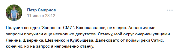 «Получил сегодня „Запрос от СМИ“. Как оказалось, не я один. Аналогичные запросы получили еще несколько депутатов. Отмечу, мой округ очерчен улицами Ленина, Шверника, Шевченко и Куйбышева. Далековато от поймы реки Сатис, конечно, но на запрос я непременно отвечу.»