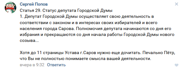 Хотя до 11 страницы Устава г. Саров нужно еще дочитать. Печально Пётр, что Вы не полностью понимаете смысла вашей деятельности.»