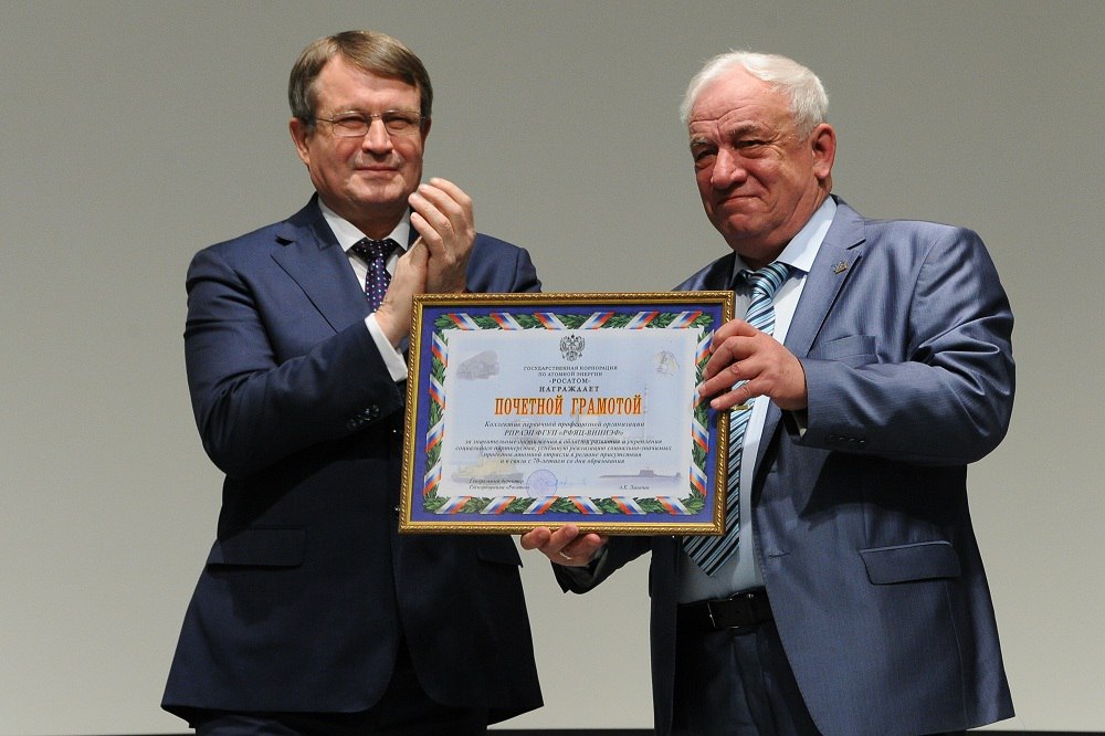 Директор РФЯЦ-ВНИИЭФ Валентин Костюков вручил коллективу профкома Почетную грамоту Госкорпорации «Росатом» и выступил с докладом «Главная ценность РФЯЦ-ВНИЭФ — его сотрудники». «Наше будущее связано с выполнением нашей основной миссии, определенной еще для КБ-11. И профсоюз для нас является незаменимым партнером», — отметил Валентин Костюков. Директор РФЯЦ-ВНИИЭФ и председатель профсоюзного комитета ядерного центра вручили награды активистам профсоюзного движения.