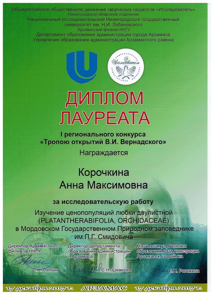 По результатам конкурса, в секции «Экология 1» была отмечена работа «Изучение ценопопуляций любки двулистной (Platantherabifolia, Огсhidасеае) в Мордовском государственном природном заповеднике им. П.Г. Смидовича». Дипломом лауреата награждена учащаяся 7 класса Корочкина Анна (кружок «Экология человека», педагог Марина Алексеевна Макеева).