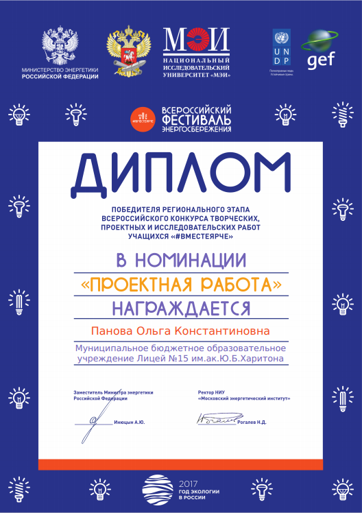 Одно из таких мероприятий — Всероссийский конкурс творческих, проектных и исследовательских работ учащихся «#ВместеЯрче». Организаторами конкурса выступили министерство энергетики Российской Федерации, программа развития ООН и Глобальный экологический фонд «Преобразование рынка для продвижения энергоэффективного освещения», министерство образования и науки Российской Федерации и Национальный исследовательский университет «МЭИ».