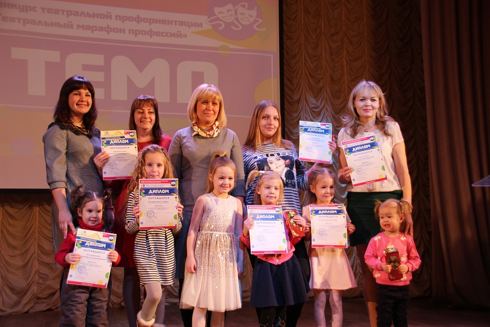 Для детей и родителей было подготовлено 84 диплома и столько же пригласительных билетов на спектакли Саровского драматического театра. В дополнение к этому основному комплекту финалисты получили сладкие подарки от компании «Саровский шоколад», а призеры «ТеМПа» — еще и сертификаты в магазин «Леонардо».