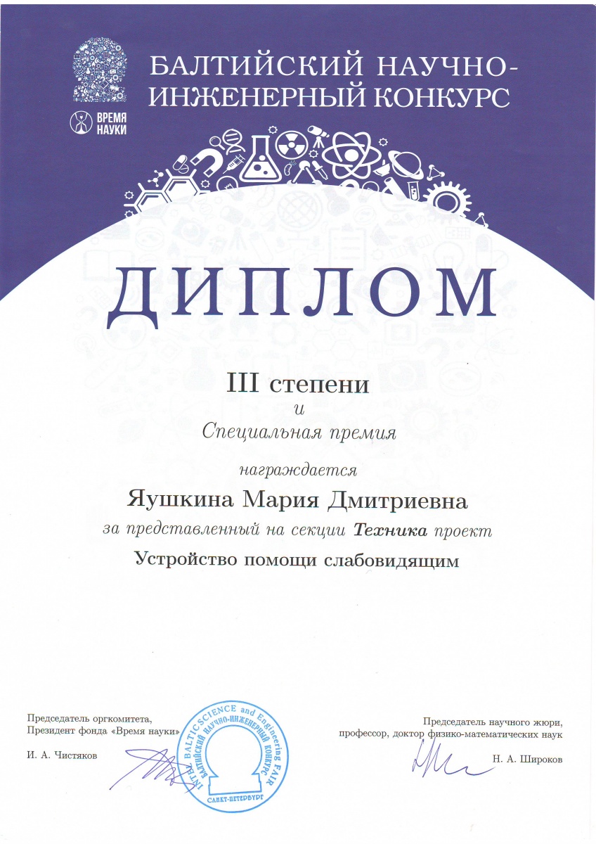 Проект Марии Яушкиной «Устройство помощи слабовидящим», представленный в секции «Техника», был удостоен диплома III степени и специальной премии. Мария также стала лауреатом премии молодёжного жюри, премии от компании «Ascreen», и лауреатом премии от концерна ЦНИИ «Электроприбор».