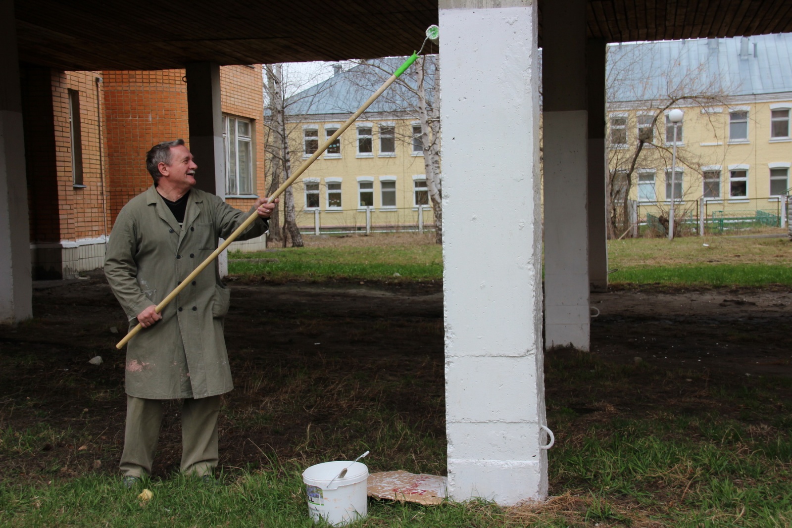 За несколько часов заметно посвежели газоны, очищенные от прошлогодней травы и листьев, забелели стволы деревьев, наряднее стали территория вокруг танка ИС-2 и фасад здания, покрашенный после ремонта цоколя.