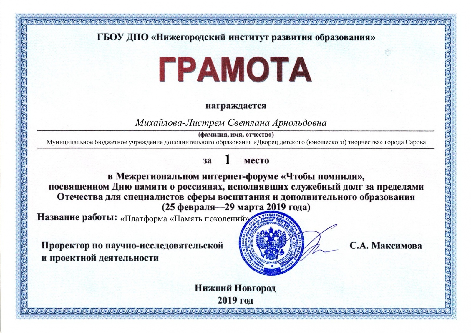 В заявке от Сарова было две разработки: платформа «Память поколений» и сценарий фестиваля солдатской песни, посвященного 30-летию вывода советских войск из Афганистана. Итогом стали грамоты за первое место, подписанные проректором по научно-исследовательской и проектной деятельности НИРО Светланой Максимовой.