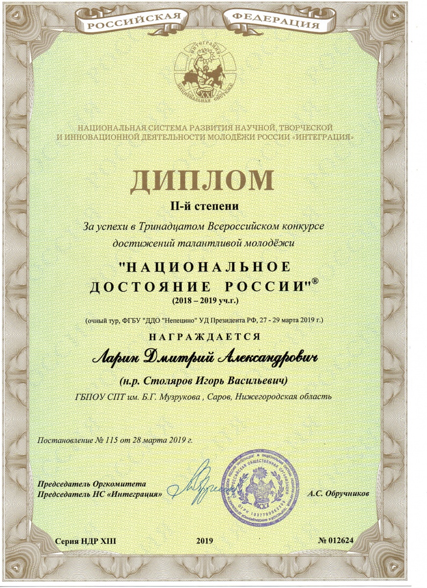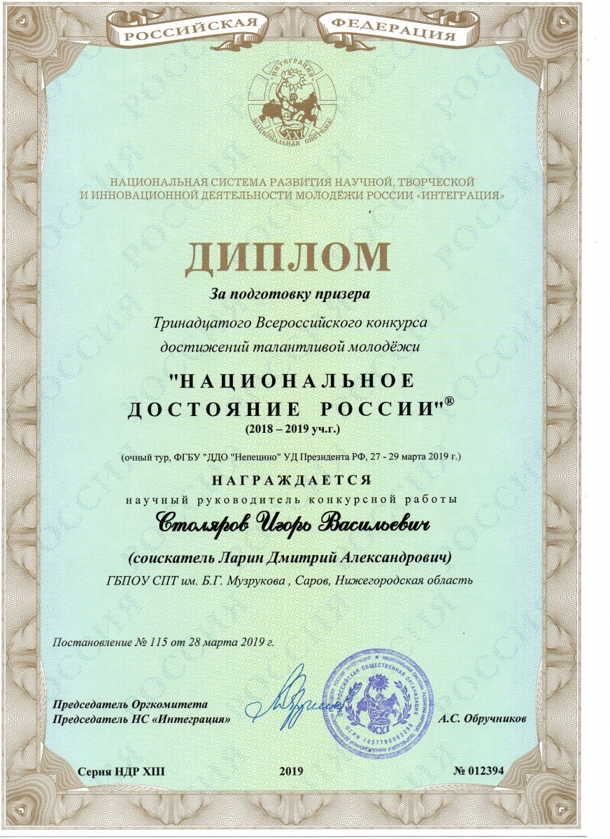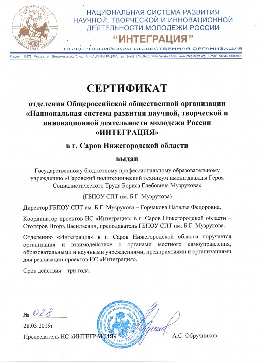 ГБПОУ СПТ им. Б.Г. Музрукова получил сертификат отделения Национальной системы развития научной, творческой и инновационной деятельности молодежи России «Интеграция» для организации и реализации проектов НС «Интеграция» в г. Саров Нижегородской области.