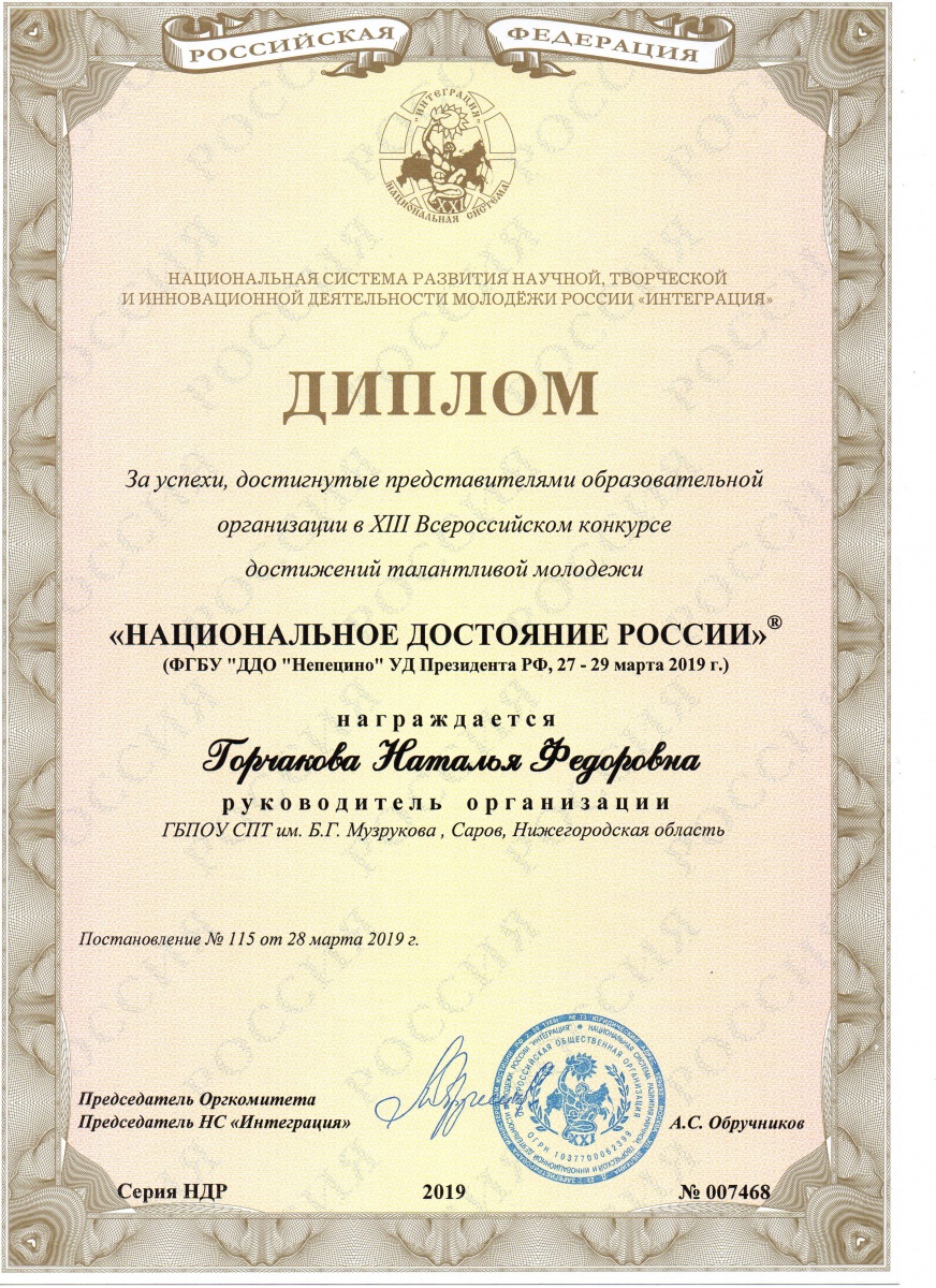 За успехи, достигнутые представителями нашей образовательной организации в XIII Всероссийском конкурсе достижений талантливой молодежи «Национальное Достояние России» директор техникума Горчакова Наталья Федоровна награждена Дипломом Национальной системы развития научной, творческой и инновационной деятельности молодежи России «Интеграция».