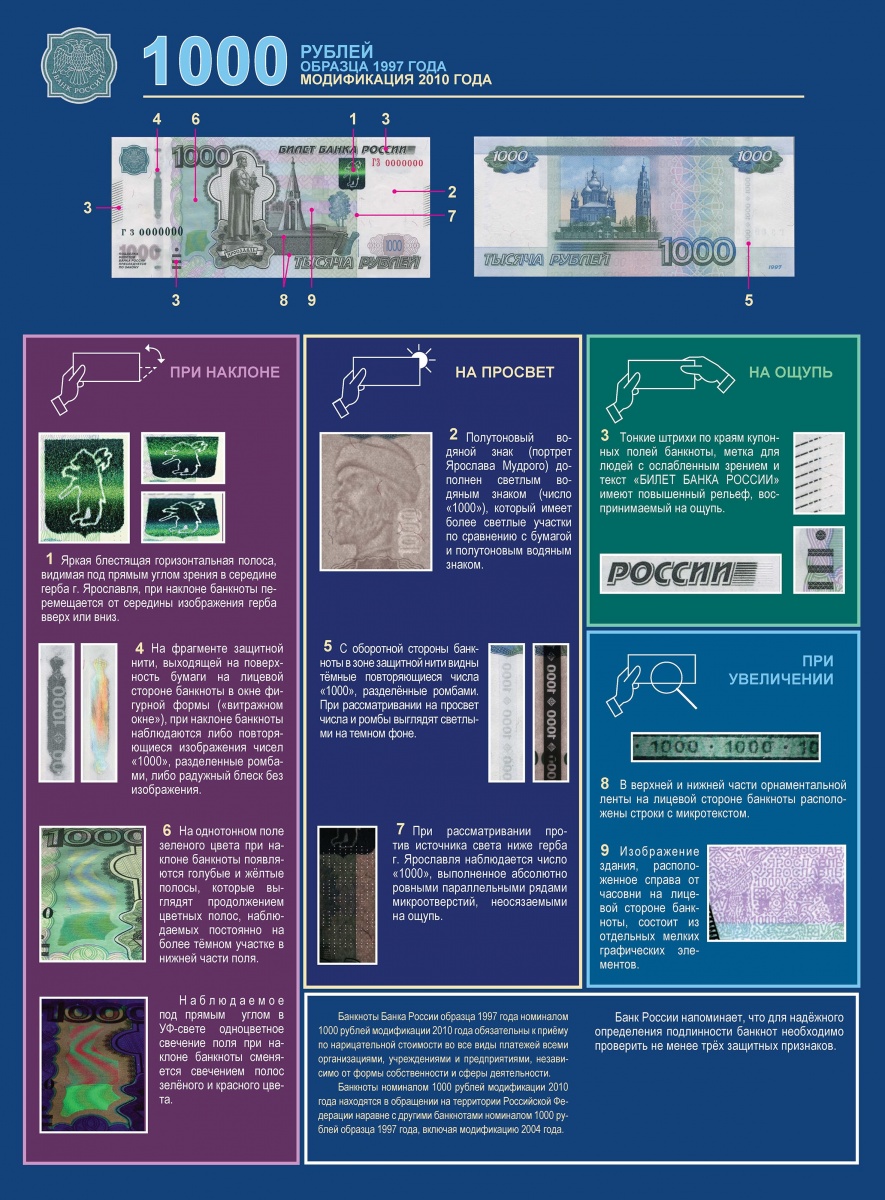 Наверняка каждый гражданин задавался вопросом какими признаками обладают фальшивые купюры? В основном, «фальшивки» изготавливают с использованием капельно-струйной печати. Характерными для такой подделки являются: отличающаяся цветопередача «фальшивки» от подлинной купюры, нечеткое изображение мелких деталей. Кроме того под воздействием воды или спирта краситель смывается, а при сгибе бумаги — краска начинает осыпаться. При изготовлении «фальшивки» электрофотографическим способом, она имеет все элементы реквизитов подлинного билета, близко подобранные цвета и размеры, но менее четкое изображение. Отсутствует вдавленность или выпуклость бумаги в местах красочных изображений, мелкие детали изображений искажены, красочный слой имеет блестящую поверхность. Фон изображений загрязнен, поля билета, и чистые участки изображения имеют вкрапления красителя, которым выполнено само изображение, при перегибе бумаги билета по красочным изображениям краситель отделяется от неё и облетает".