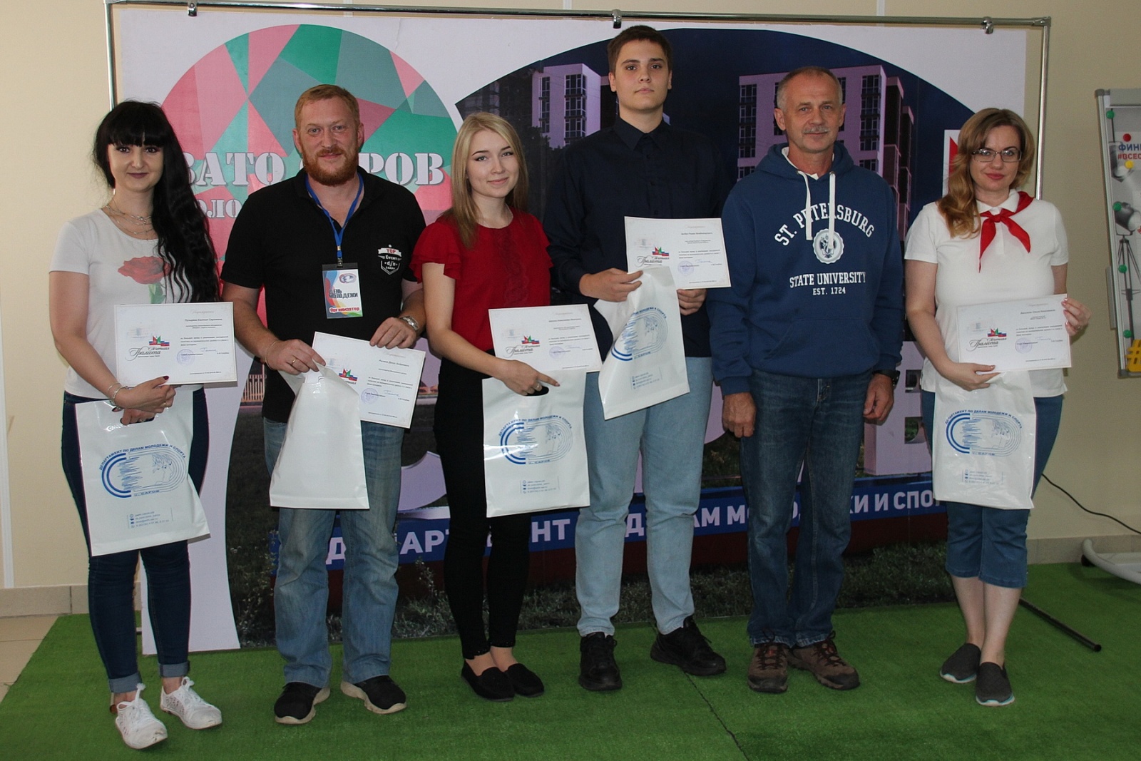 За инициативу и творчество грамотами департамента по делам молодежи и спорта награждены активисты координационного совета союза «СтаТУС» Артем Белавин и Елизавета Зуева, а также председатель детской палаты «Галактика» СДО «Сияющие звезды» Анастасия Виноградская.