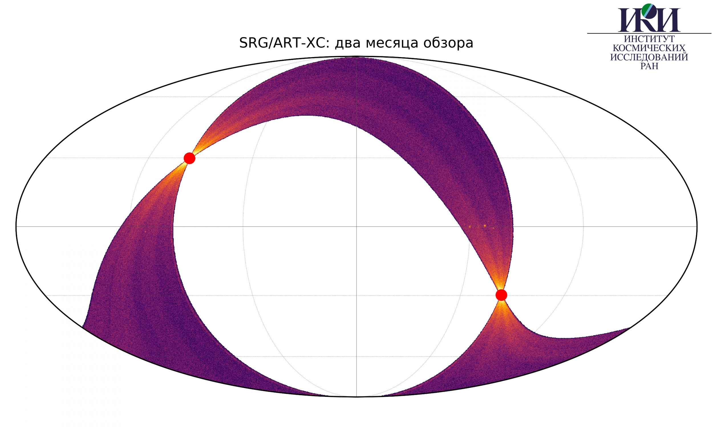 Представленная ниже карта получена из всех зарегистрированных за двухмесячный период фотонов в жёстком рентгеновском диапазоне энергий. Красными точками отмечены области полюсов обзора, где наблюдается повышенная экспозиция и соответственно большее количество зарегистрированных фотонов.