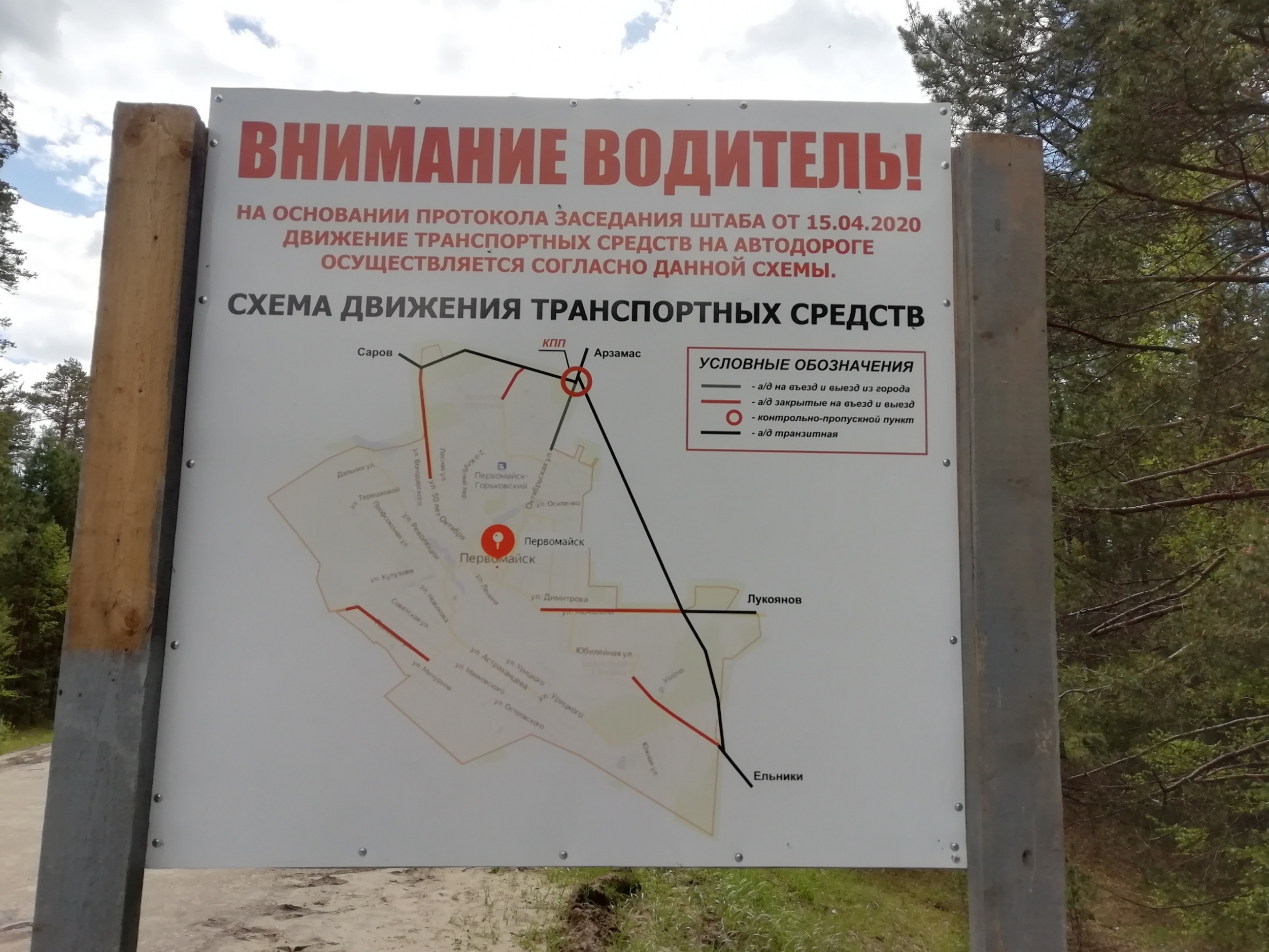 На схеме видно, что дорога не перекрыта. Перекрыт въезд в город по улице 50 лет Октября. Со стороны Сарова спокойно движемся по объездной Первомайска и проходим через КПП на ул. Октябрьской. |