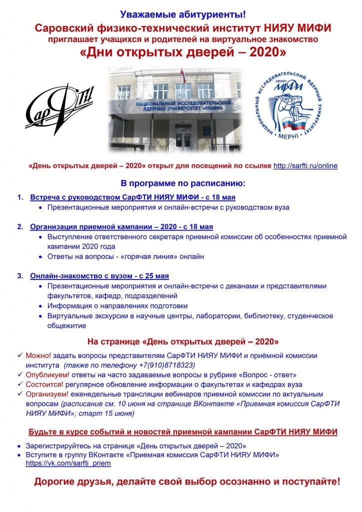 В Саровском физико-техническом институте НИЯУ МИФИ стартовал День открытых дверей — 2020 в режиме онлайн (https://sarfti.ru/online).