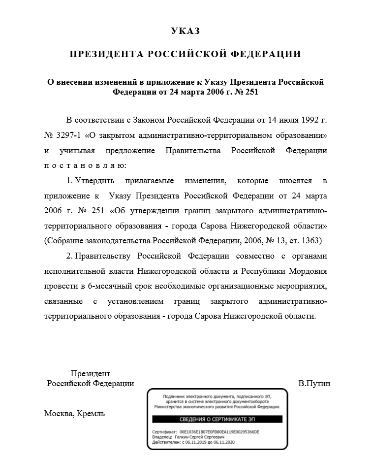 В администрацию поступил проект указа президента об изменении границ Сарова