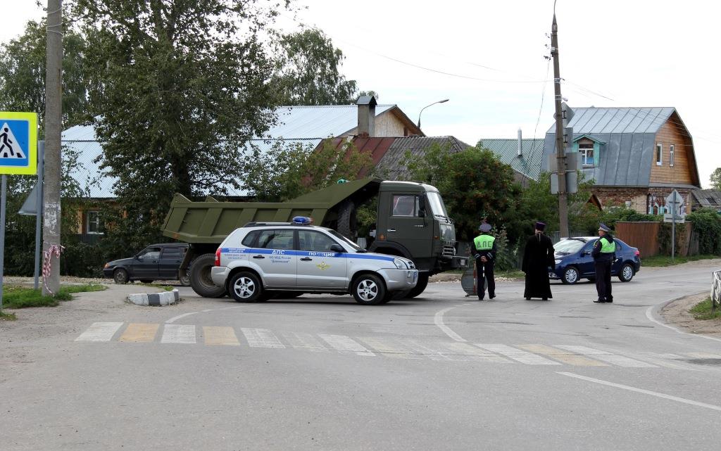 Первое фото особенно радует. Автомобильное движение по центру села было перекрыто. Контроль осуществляют сотрудники ДПС. И батюшка.