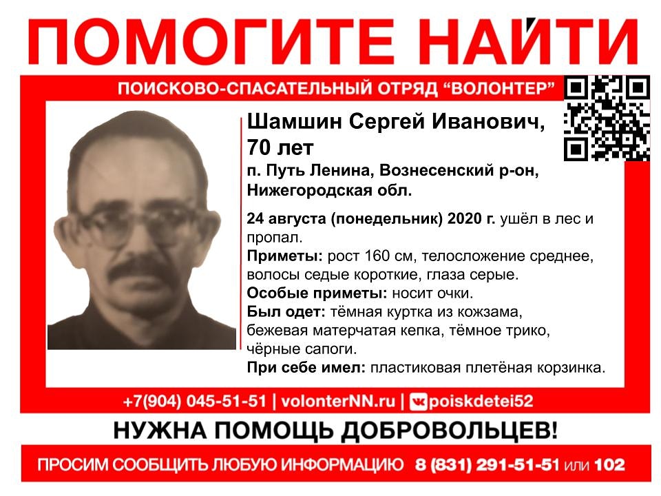 Сейчас мы обращаемся к каждому, кто читает эти строки: нам (поисковикам, кинологам, сотрудникам спец служб, просто неравнодушным людям, кто провел эту неделю практически не вылезая из лесов Вознесенского района) и Сергею Ивановичу Шамшину очень нужна Ваша помощь. Мы очень ждём Вас завтра, в субботу 29 августа 2020 г. в 8.00 в п. Путь Ленина, Вознесенского района.