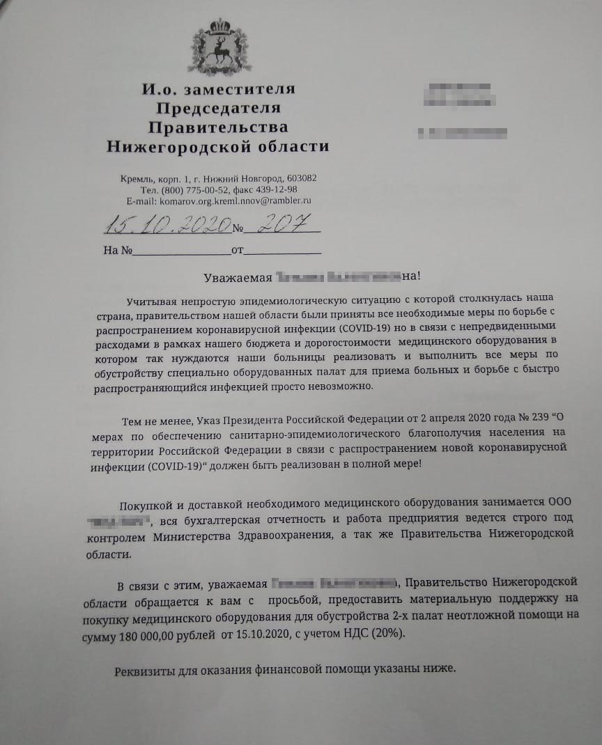 В нижегородские предприятия приходят фейковые письма якобы от правительства. В них просят «предоставить материальную поддержку на покупку медицинского оборудования для обустройства палат неотложной помощи».