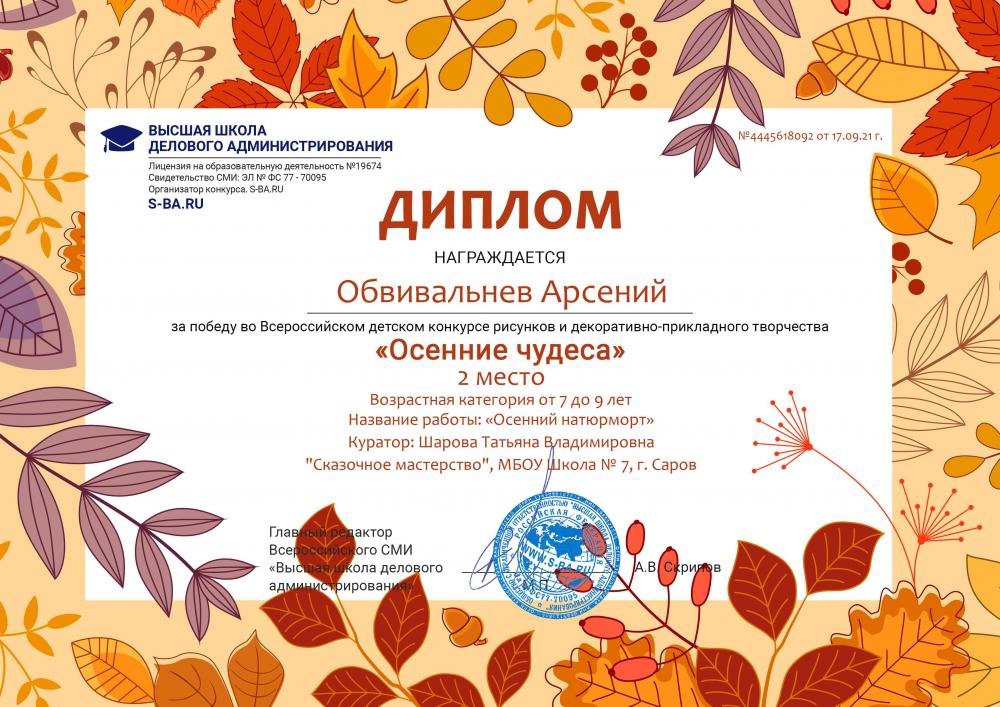 Саровские ребята заняли призовые места на Всероссийском детском конкурсе рисунков и декоративно-прикладного творчества «Осенние чудеса».