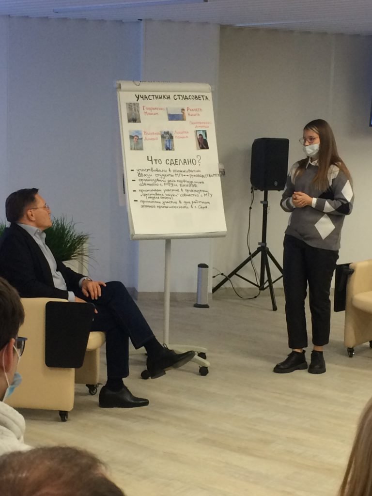 1 октября 2021 года в Технопарке «Саров» прошла вторая встреча генерального директора Госкорпорации Росатом Алексея Лихачёва со студентами первого набора Филиала МГУ им. М.В. Ломоносова в Сарове. Встреча носила дружеский, неформальный характер и была похожа на беседу знакомых о жизни, делах и заботах. За месяц после первой встречи в студенческом кампусе появился свой студсовет и у каждого его члена есть четко очерченные задачи — это научная деятельность, спортивная и культурно-массовая жизнь.