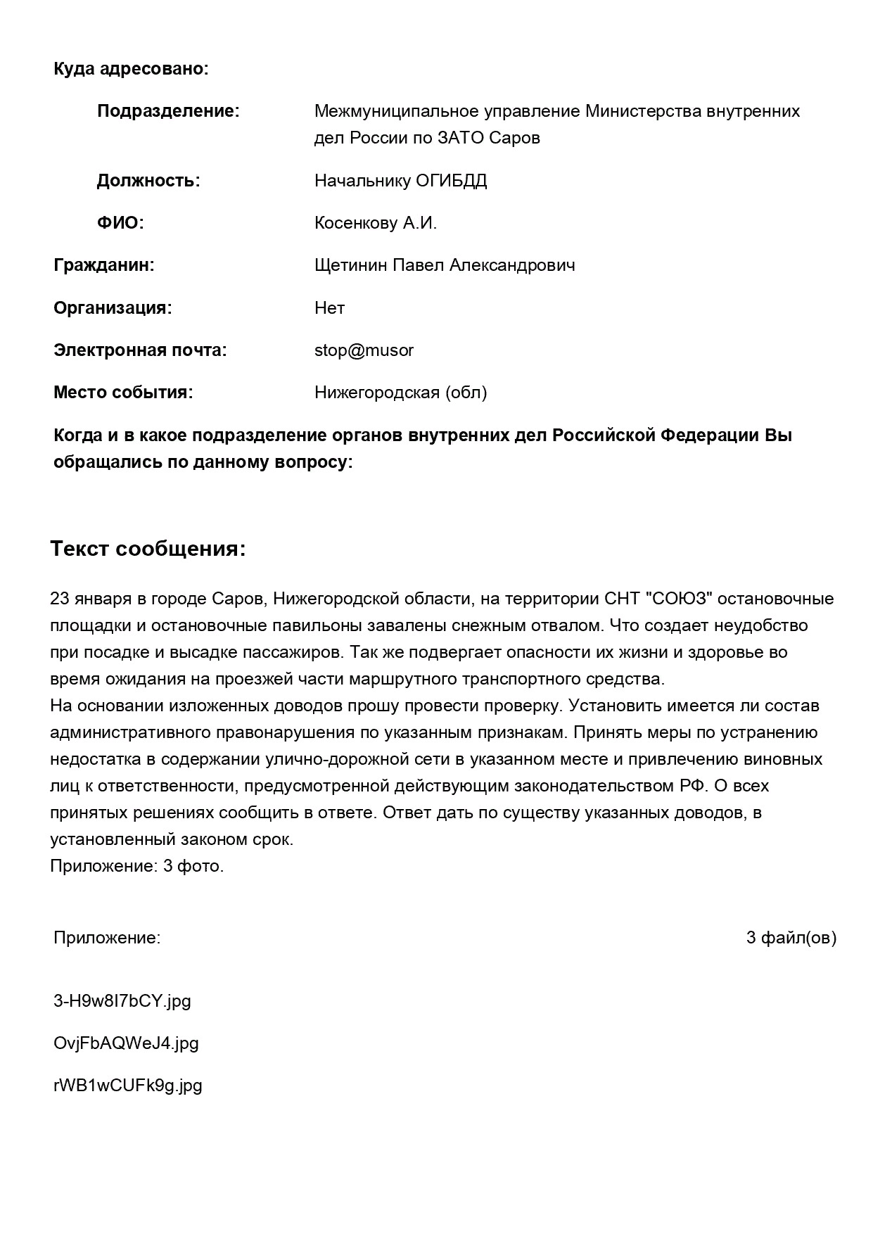 На этот раз оставил обращение по заваленным остановкам на территории СНТ «СОЮЗ». Дорогу расчищают, а остановочные площадки забывают, что является небезопасным и создает неудобство. Кто ни будь видел чтоб их расчищали в течении сезона?