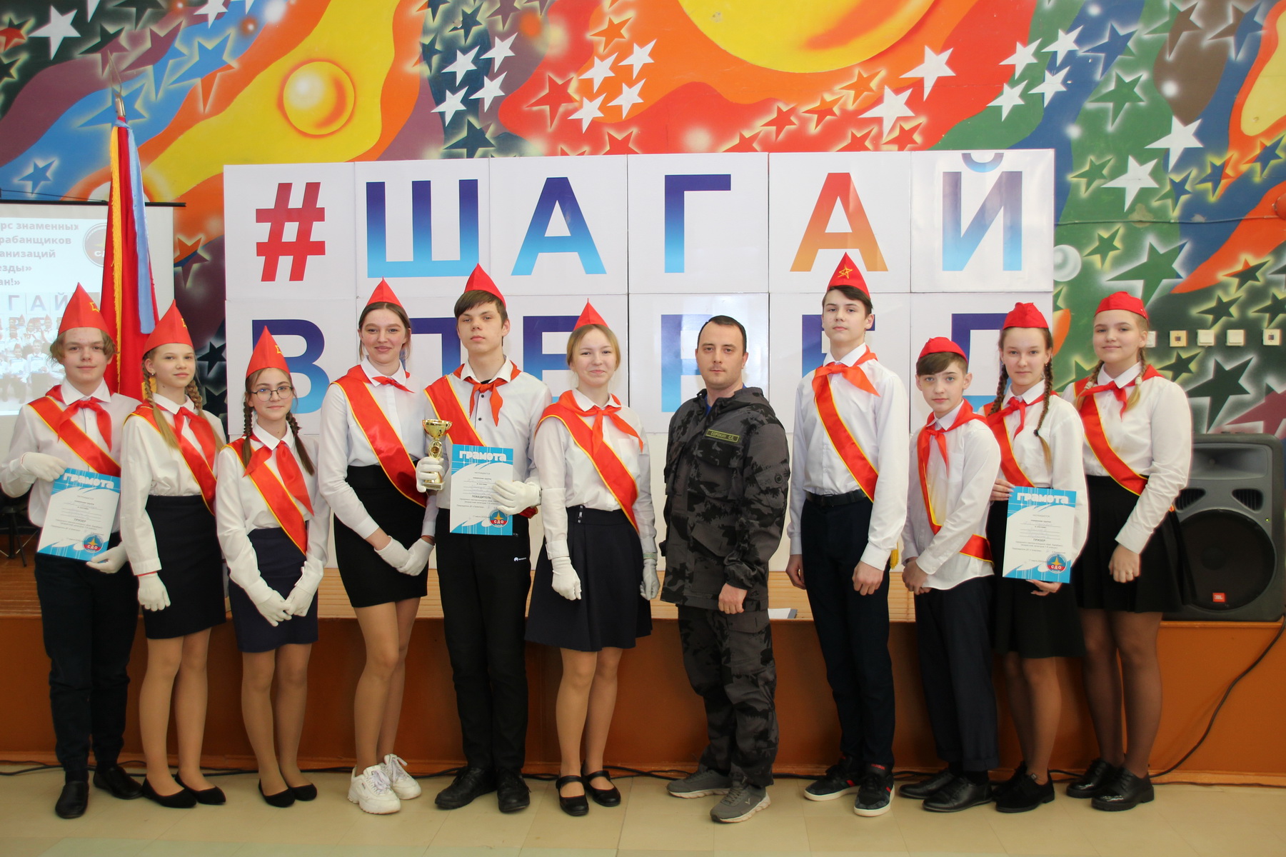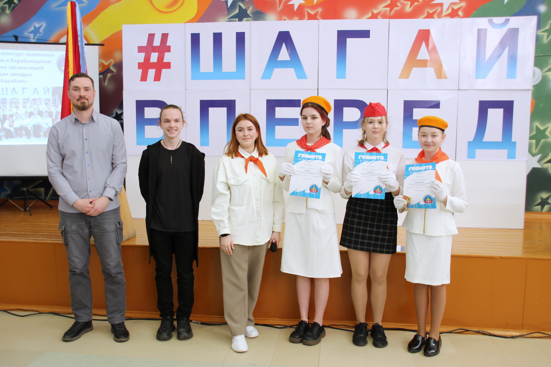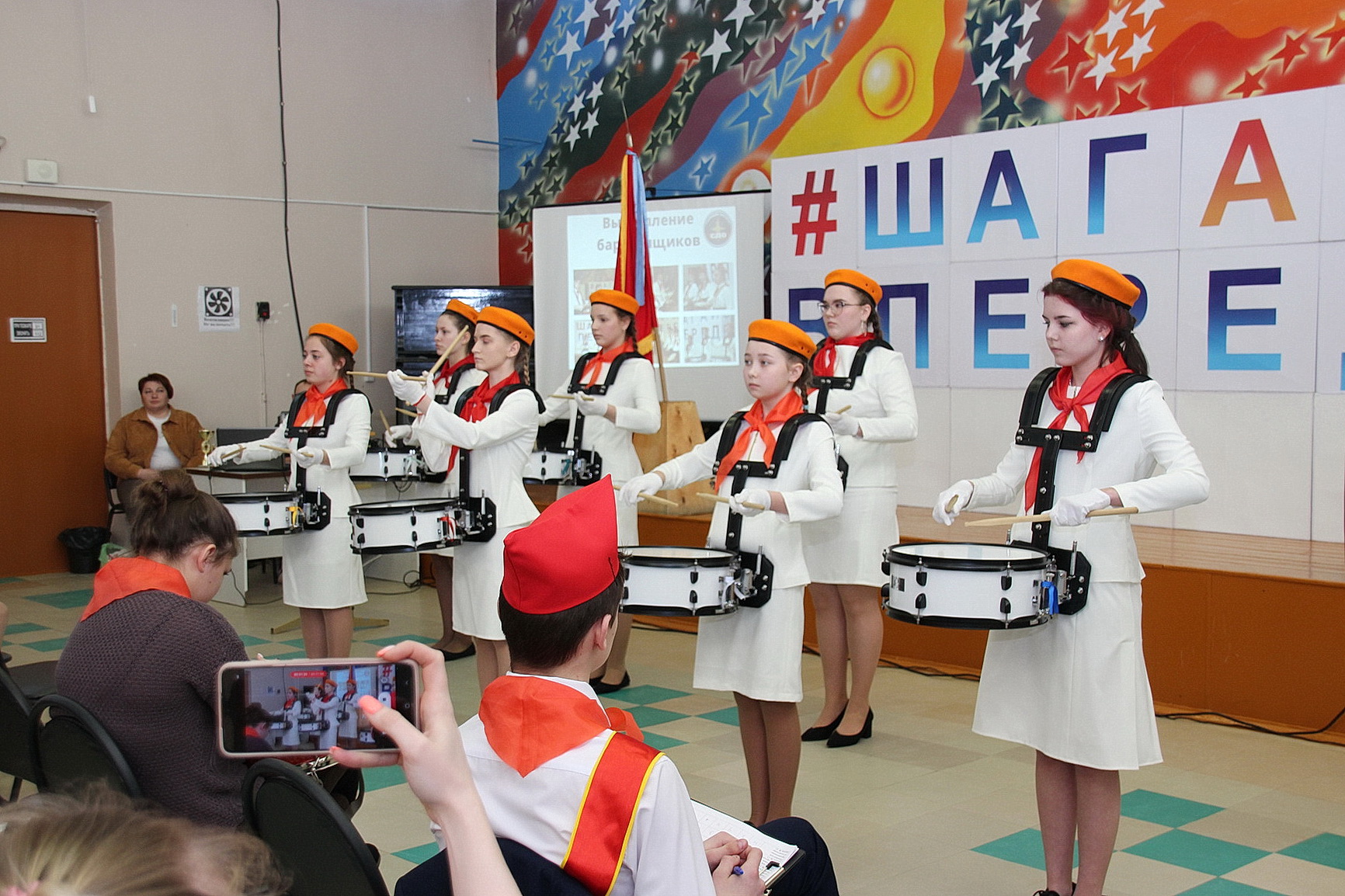 По традиции с показательным номером выступил сводный отряд барабанщиков. Девочки подготовили и впервые показали новую музыкальную композицию. Теперь по итогам конкурса будет сформирован окончательный состав, и все вместе ребята начнут отрабатывать свое выступление к майским мероприятиям — митингам, посвященным приему в пионеры, Дню Победы и Дню Пионерии.