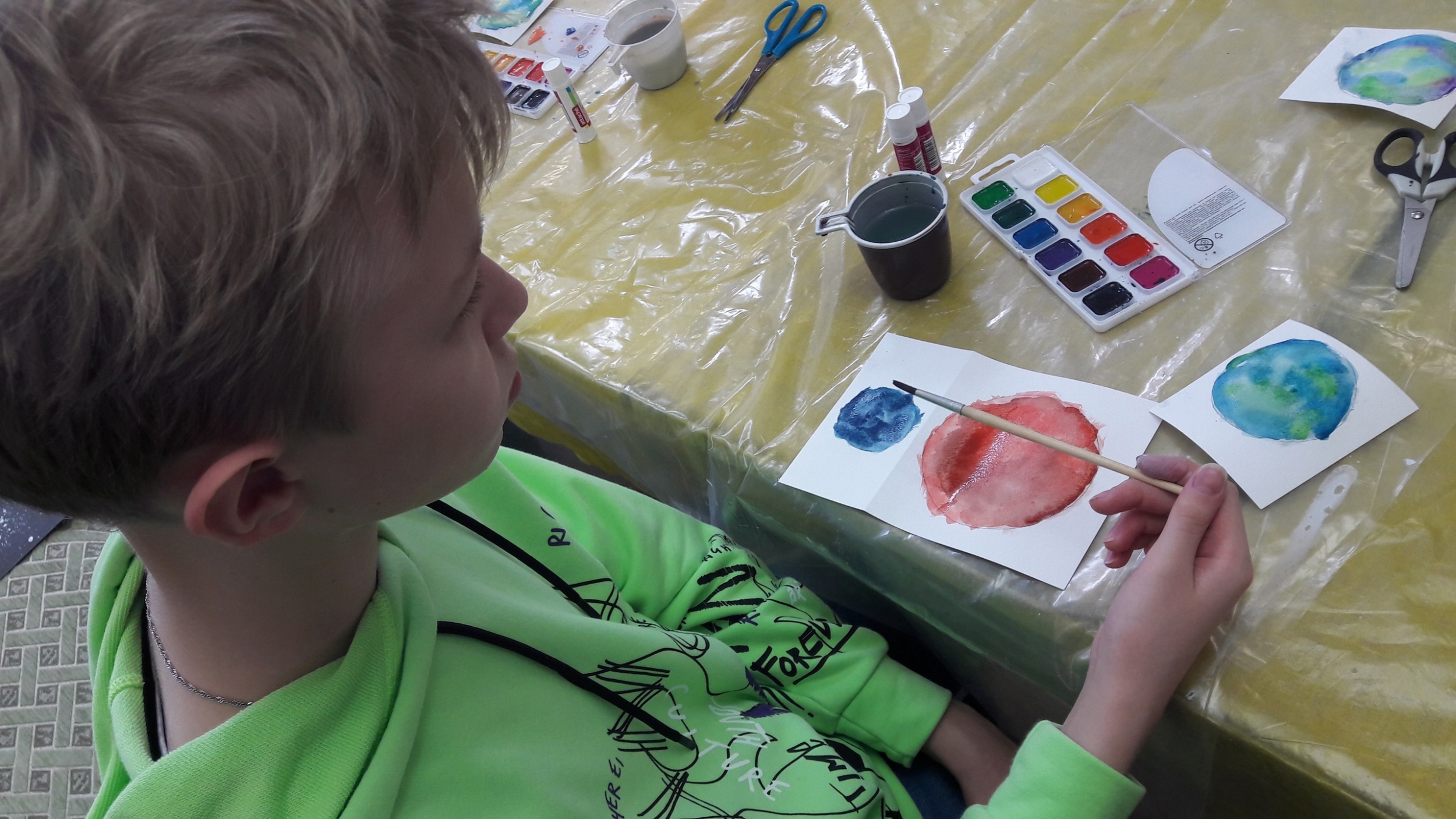 В процессе работы ребята писали акварелью планеты солнечной системы, занимались аппликацией и бумагопластикой, а также знакомились с нетрадиционными живописными техниками — «набрызг» и «по-сырому». Участники клуба «Лотос» творчески подошли к делу, активно обсуждали и предлагали свои идеи, ведь живописные техники представляют большой простор для воображения, поэтому и композиции получились оригинальные и необычные.