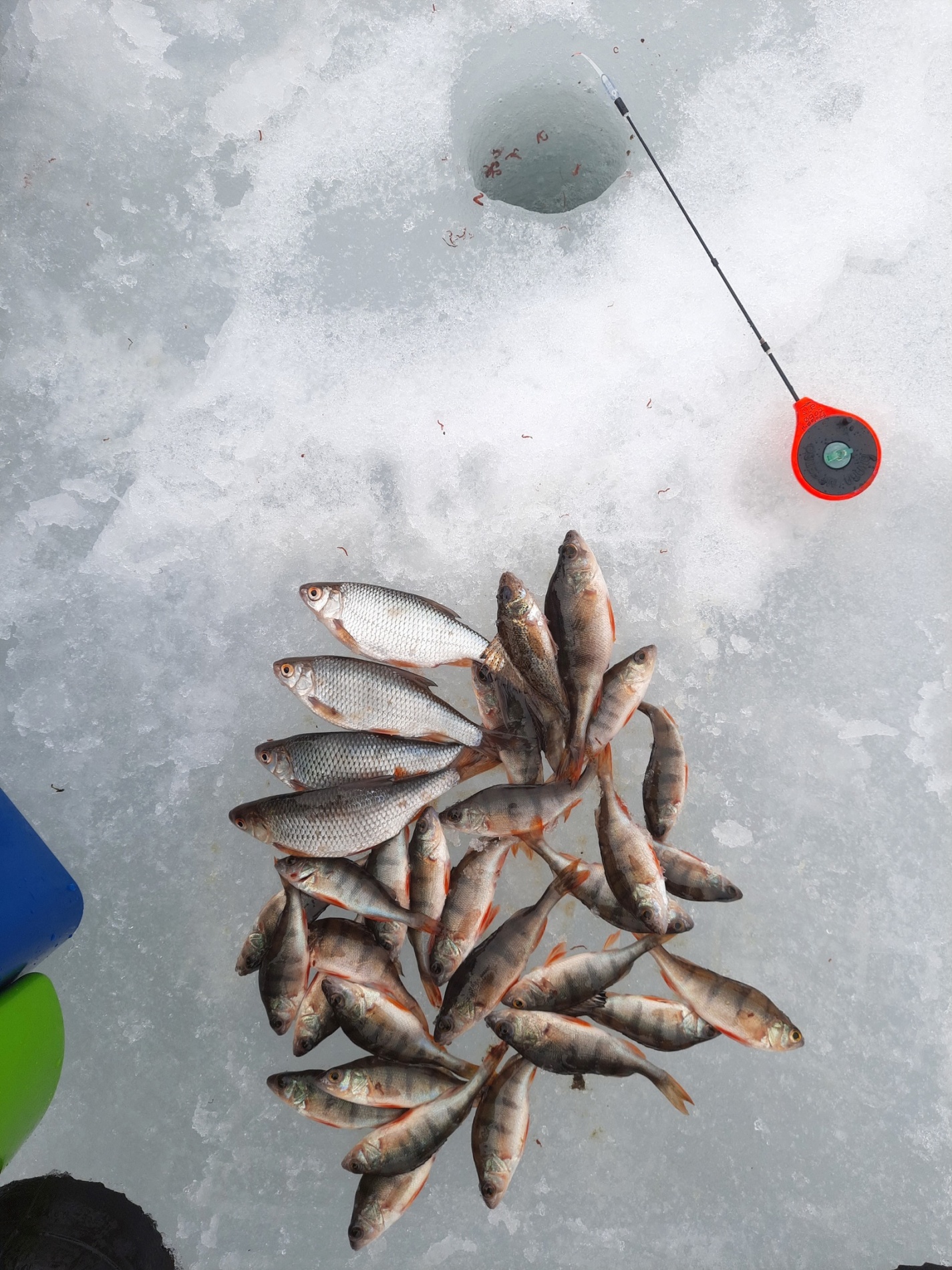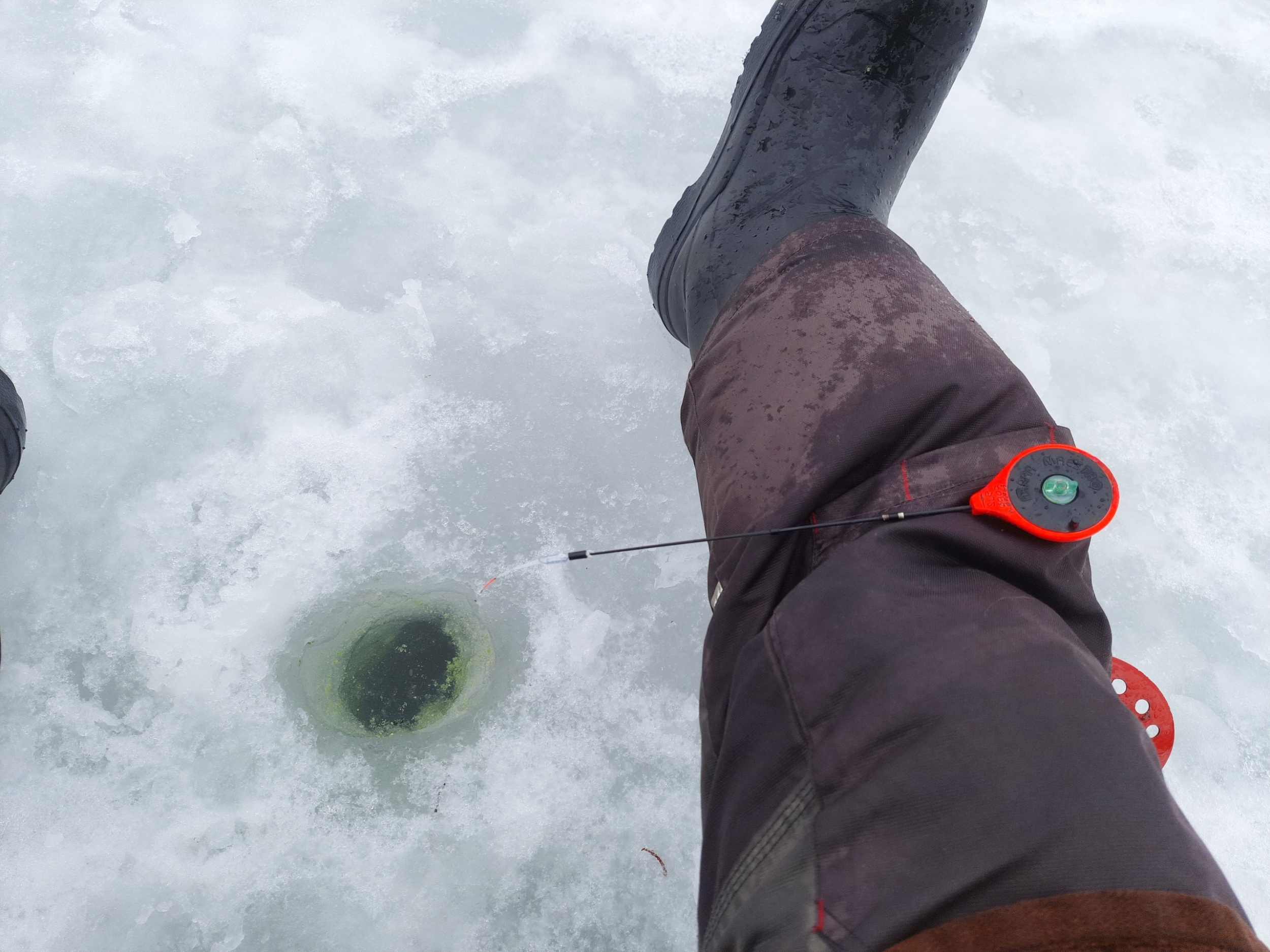 Закрытие зимнего сезона состоялось 3 апреля 2022 года, как и в ковидном 2021 году, уже традиционно на пруду «Боровом» на Саровке в Сарове. Погода не радовала, периодически начинался «дожде-снег» под ветер сильный. Вышел на водоем к обеду и рыбачил до вечера. Костюм снаружи промок, внутри не успел. Закормил более трех десятков лунок по обоим берегам, сухой смесью в чистом виде, с добавкой кормового мотыля и чистоганом кормовым. Более половины лунок использовал старых чужих. Лед на пруду в норме, в районе 25−30 см. Лунки не мерзли. Народу человек 5−6, периодически приходили-уходили, клева сильного не было видимо. По словам аборигенов уклея и плотва ловись с неделю назад. Ловил на 0,063, на часик переходил на 0,07. Мормышки 2,0−2,65. Начал на лесу 0,063 с мормышками 2,0, вроде пошли поклевки, перешел на 0,07 с 2,65. Плотвички попались подряд в течение 30 минут, будто был выход какой, все еще на 0,07 лесу с мормышками 2,65. А потом все, только окушата на лесу 0,063. Народ до следующей субботы еще выходил на лед «Борового». Итого 800 г.