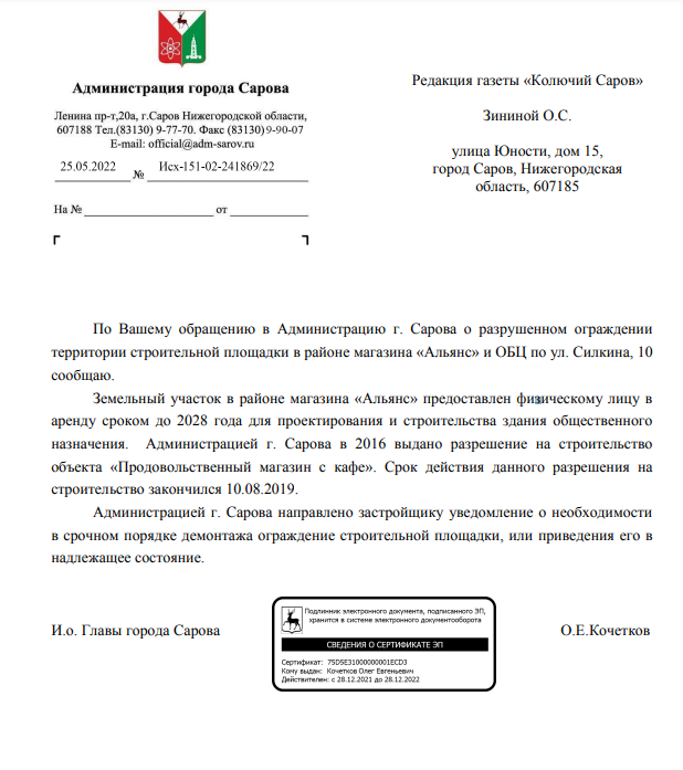 К нам в редакцию обратилась жительница Сарова с просьбой помочь разобраться с аварийным забором возле магазина «Альянс» на ул. Силкина.