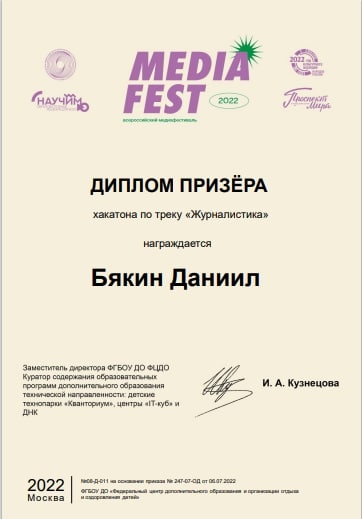 Кванторианец Даниил Бякин стал призером Всероссийского хакатона MEDIA FEST 2022