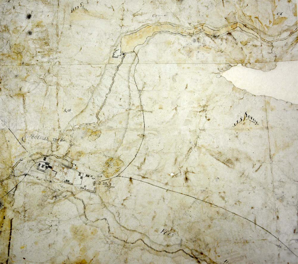 Фрагмент карты с обозначенными постройками монастыря (внизу слева). Вверху — Маслихинская мельница и пруд при ней