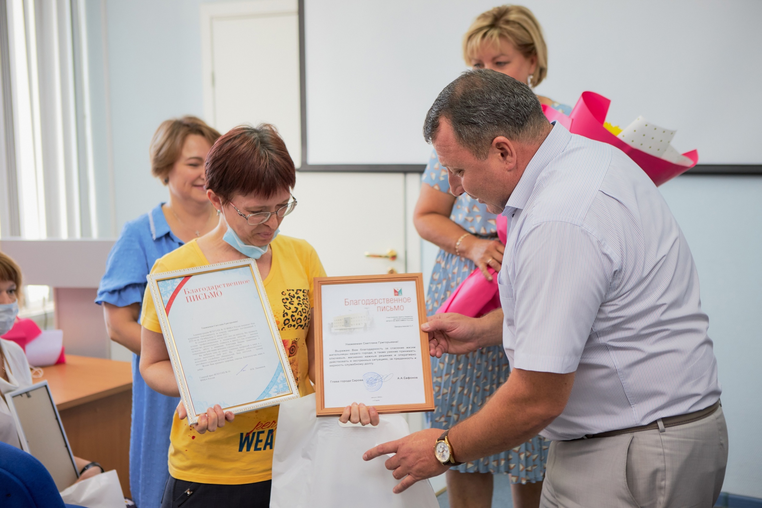 За спасение жизни пострадавшей в ДТП саровчанки Светлану Григорьевну и Елену Викторовну наградили благодарственными письмами от руководства КБ № 50 ФМБА России и администрации города. С теплыми словами признательности к ним обратился главный врач Игорь Лашманов.