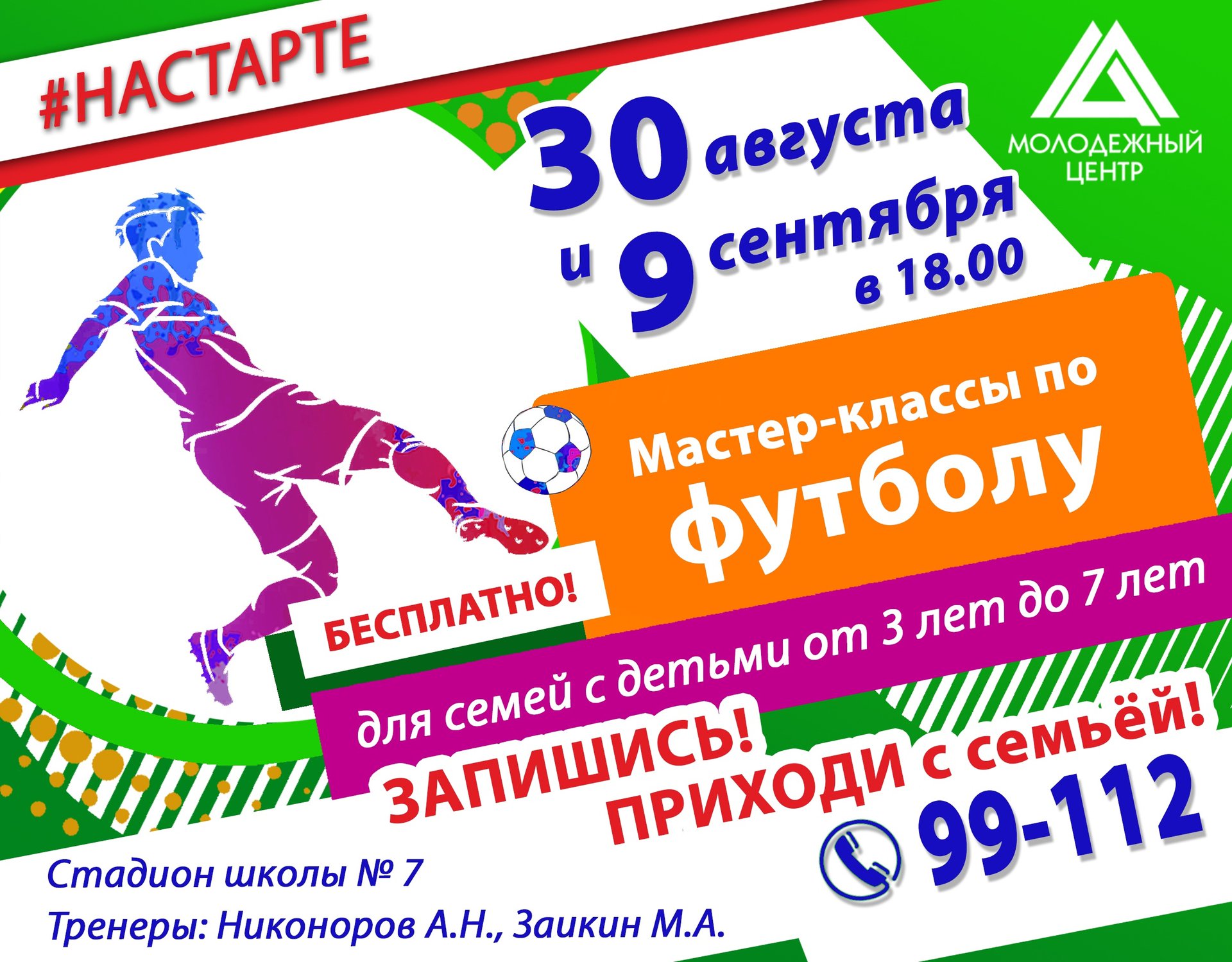 30 августа (вторник) и 9 сентября (пятница) в 18.00 приглашаем семьи с детьми от 3 лет до 7 лет на мастер-классы по ФУТБОЛУ в рамках проекта #НАСТАРТЕ.