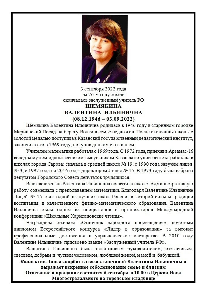 3 сентября ушла из жизни Валентина Ильинична Шемякина, много лет возглавлявшая лицей № 15