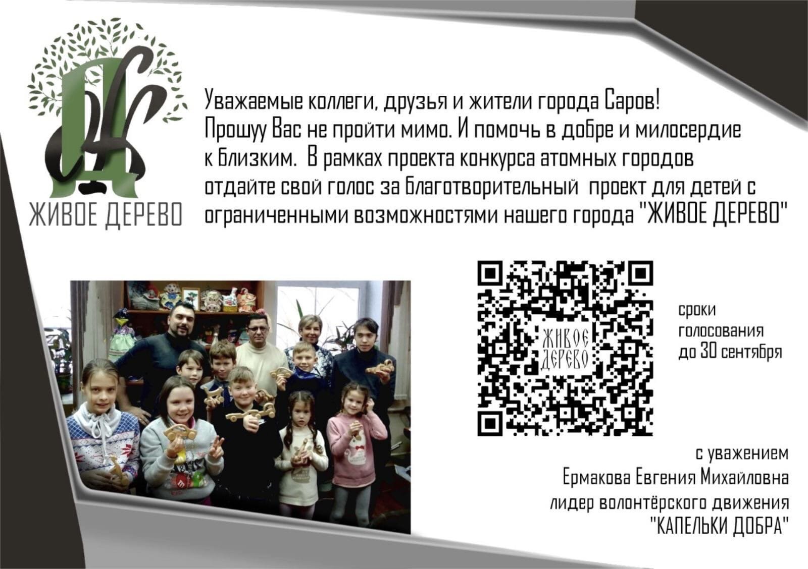 Саров на конкурсе представляет благотворительный проект для детей с ОВЗ «Живое Дерево» (движение «Капельки добра», лидер движения — Евгения Ермакова)
