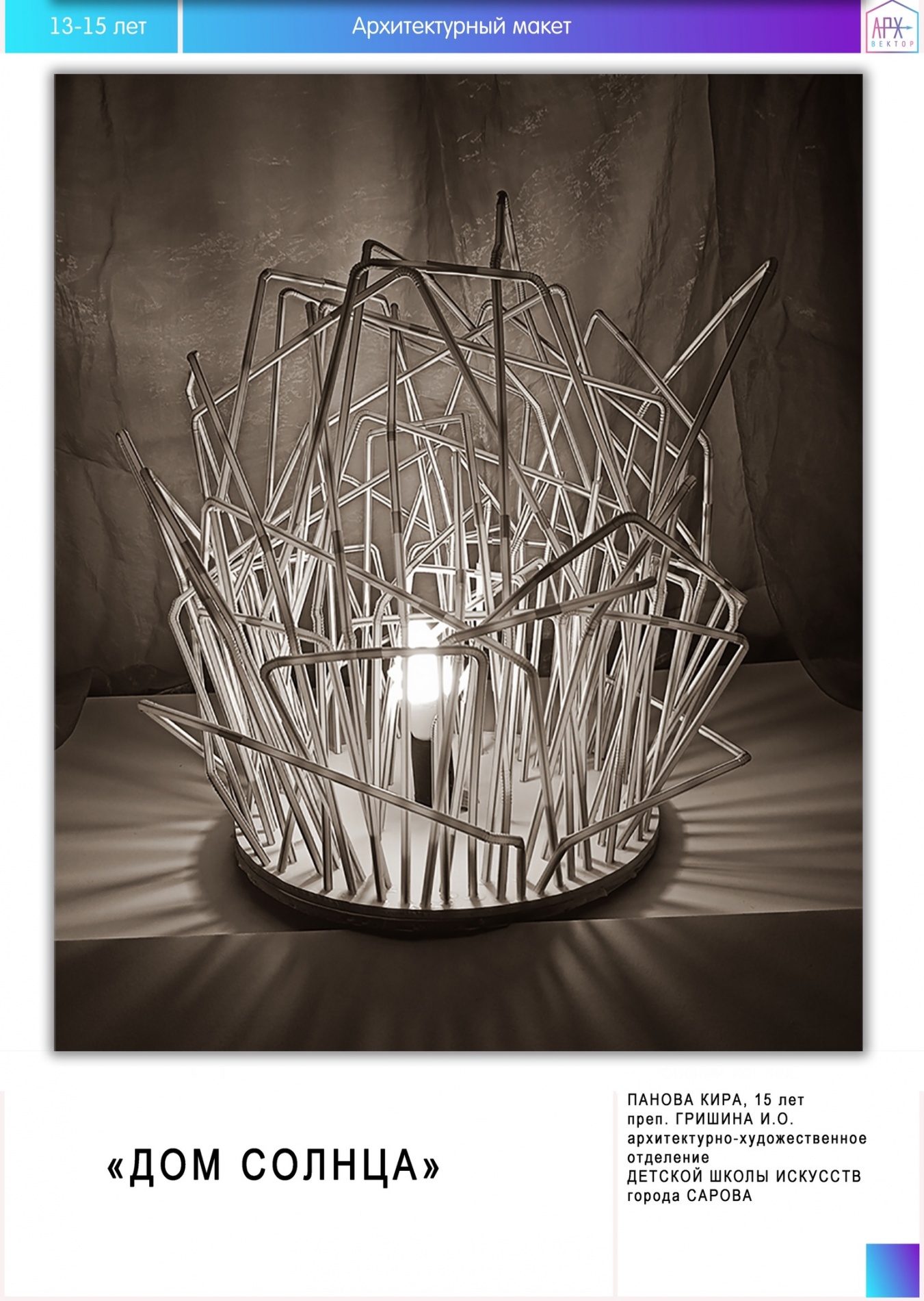 Саровчанка Панова Кира, учащаяся архитектурно-художественного отделения, стала лауреатом 3 степени. Ее работа «Дом солнца» была отмечена в номинации «Архитектурный макет». Творческая работа учащихся пятого курса «Архитектурное дефиле от мастера» в номинации «Взгляд мастера» также стала лауреатом 3 степени. Поздравляем ребят и их преподавателя Гришину Инессу Олеговну с прекрасными результатами!