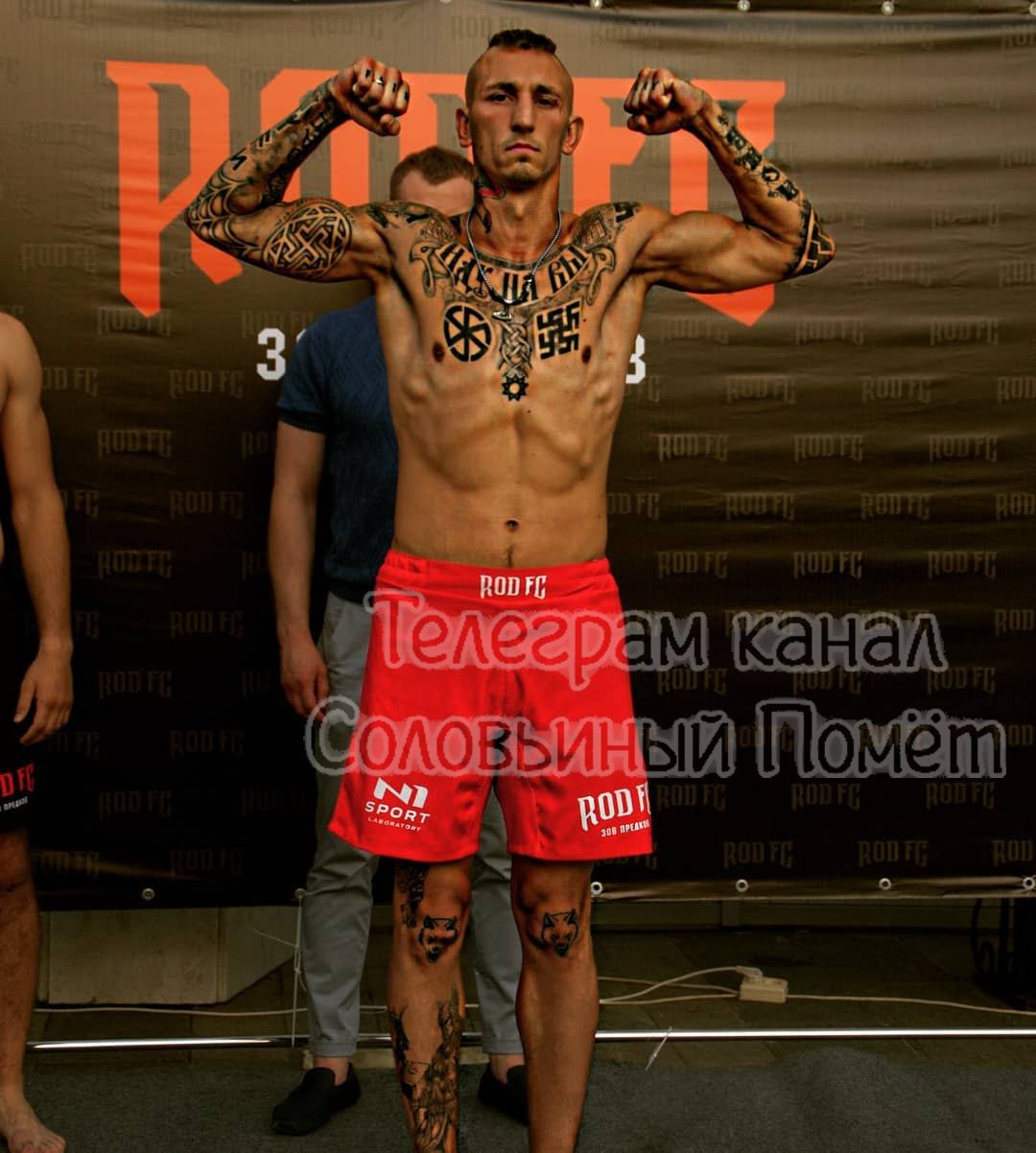 «На правом плече татуировка в виде свастики, на левом плече знак белого братства, кельтский крест, на правом предплечье A.C.A.B, две восьмерки, на правом запястье цифра 14 в солнце» [14/88 — кодовый лозунг неонацистов, число 14 соответствует количеству слов во фразе: «We must secure the existence of our people and a future for white children» — «Мы должны защитить само существование нашего народа и будущее для белых детей», 88 — закодированное приветствие «Heil Hitler!» («Хайль Гитлер!»), поскольку буква «H» стоит в латинском алфавите восьмой].