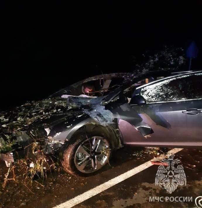 Причиной аварии вчера поздно вечером стал перебегающий дорогу лось. От удара машину сильно покорежило, людей заблокировало внутри.